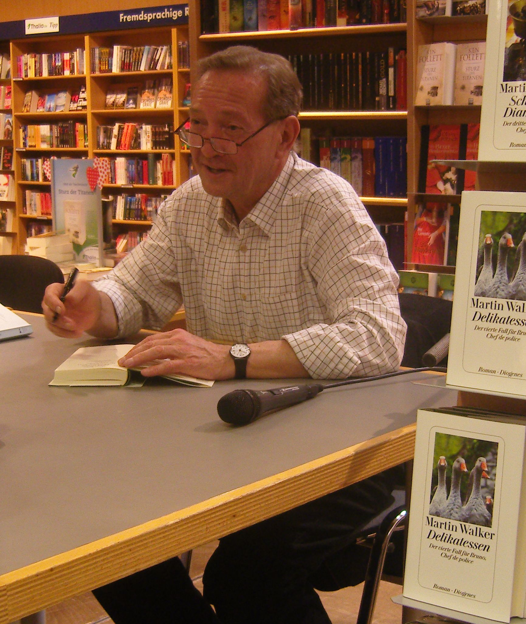 Die Lesung zu seinem neuen Roman „Delikatessen“ fand am 04.05.2012 in der Thalia-Buchhandlung in den Hallen „Am Brosigturm“ in Berlin statt. 20:15 Uhr ging es los und schon zu Beginn tummelten sich Leser am Stand der Weinverkostung, die gleichzeitig zu Walkers Lesung als Extra-Schmankerl dazu gehörte. Es gab Weine aus dem Bergerac von denen der Autor selbst ein Loblied singen konnte. Zusammen mit der Journalistin und Moderatorin an diesem Abend, Margarete von Schwarzkopf, gestaltete sich ein amüsanter und höchst abwechslungsreicher Leseabend.