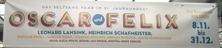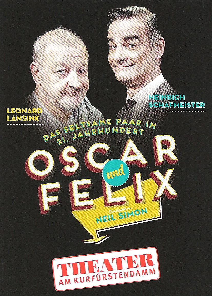 Oscar und Felix – „Unter der Regie von Katja Wolff stehen Leonard Lansink, Heinrich Schafmeister, Dietmar Pröll, Marcus Born, Joachim Kwasny, Mirjam Radovic und Amor Schumacher auf der Bühne. Für das Bühnenbild ist Jan Freese verantwortlich, für die Kostüme Heike Seidler.“