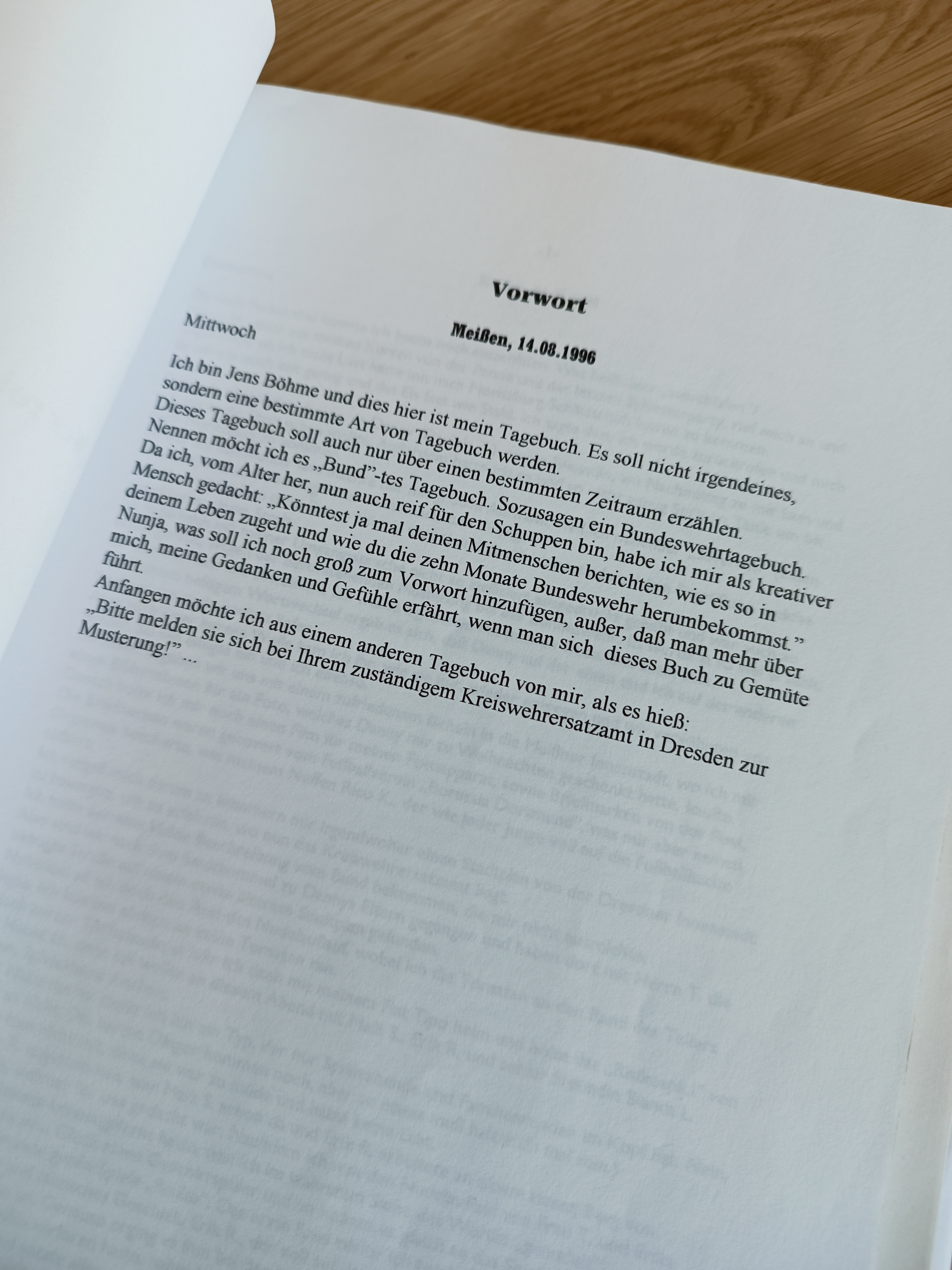 BUNDESWEHR – das war damals noch Pflicht! Ich habe auch während der gesamten Bundeswehrzeit ein Tagebuch geschrieben, was ich „(BUND)-tes Tagebuch“ nannte. Ich hadere immer noch mit der Veröffentlichung. Zum einen, weil ich die Namen aller vorkommenden Personen erst ändern müsste und zum anderen, gibt es in diesem Tagebuch ein paar Stellen, die vielleicht nicht für die Öffentlichkeit gedacht sind. Tatsächlich existieren knapp 80 Tagebuchseiten A4, kleinste Schrift (das kommt also was an Seiten auf Taschenbuchformat heraus). In der Zeit nach der Bundeswehr – einer Zeit der Orientierung und einer sehr freien Zeit kurz vor der Jahrtausendwende – habe ich dann die Tagebucheinträge bis in die Studentenzeit in eine Worddatei übertragen. Das Tagebuch war wie so oft – handschriftlich.