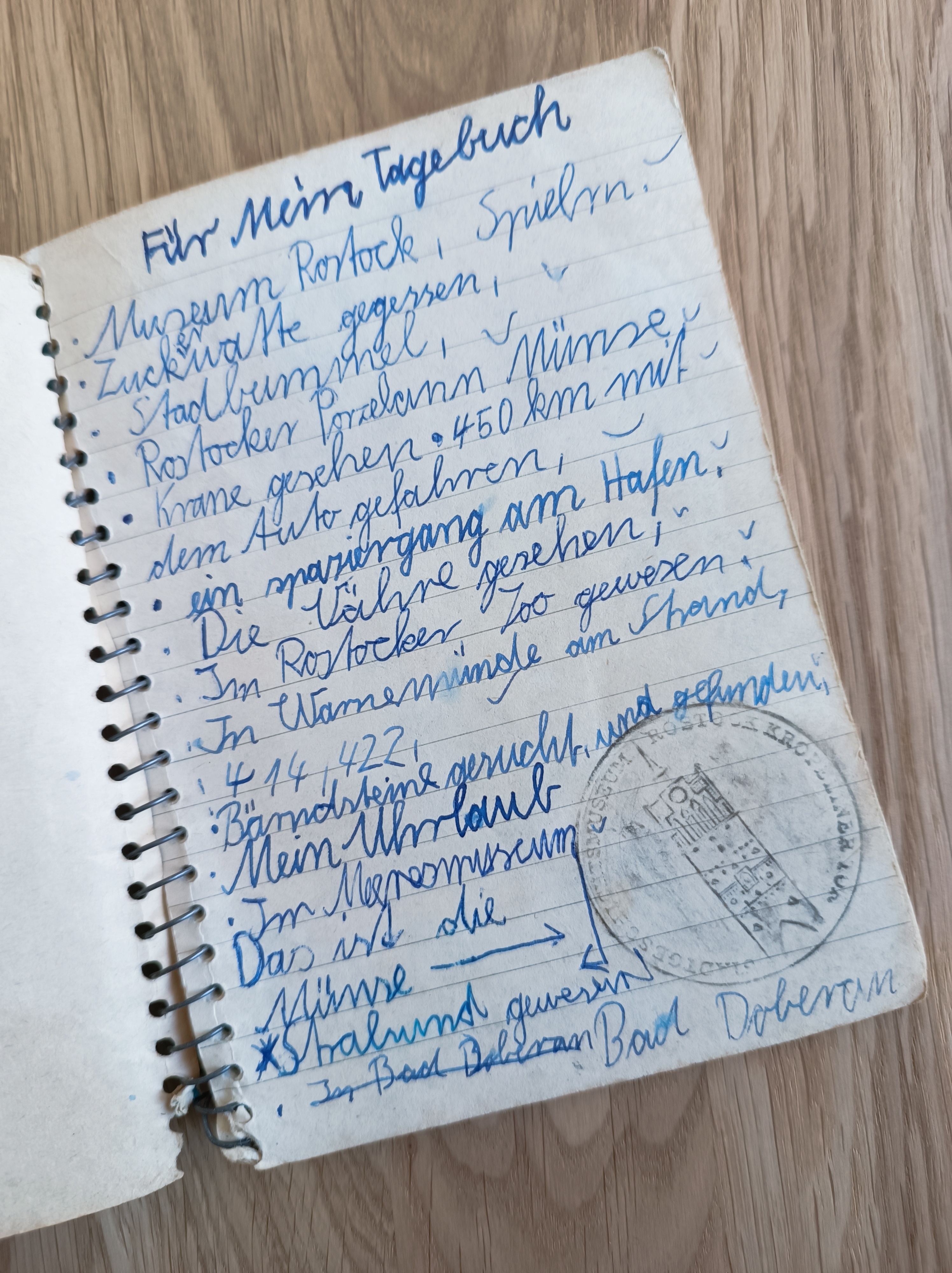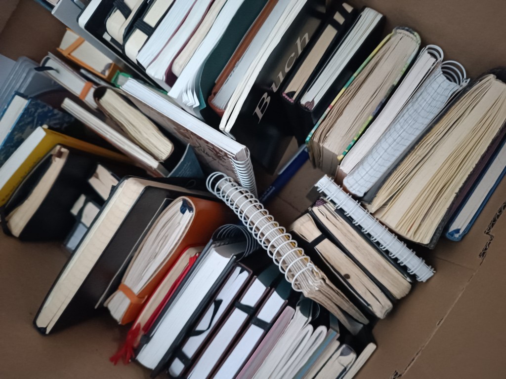 Ich bin schon seit jeher ein großer Fan von Tagebüchern bzw. vom Schreiben eigner Tagebücher. Ungefähr in der 2. und 3. Klasse ging es los. Ich habe mir vor allem kleine Heftchen zusammen getackert oder gar mit Nadel und Faden zusammen gebunden. Es sollte ja ein eigenes kleines Büchlein – ein Tagebuch – sein. In der DDR gab es gefühlt nicht an jeder Ecke die Möglichkeit ein solches Blanko-Buch oder ein Buch mit Linien zu kaufen. Die selbst gebastelten Büchlein waren oft Tagebücher, die ich mit in den Urlaub nahm, um in ihnen meine Urlaubserlebnisse niederzuschreiben. Ab und zu habe ich dann auch mal eine Eintrittskarte von einem Museum oder einen Kassenzettel von vor Ort eingeklebt; auch mal die ein oder andere Skizze eingefügt – einfach ein Bild hinein gemalt.