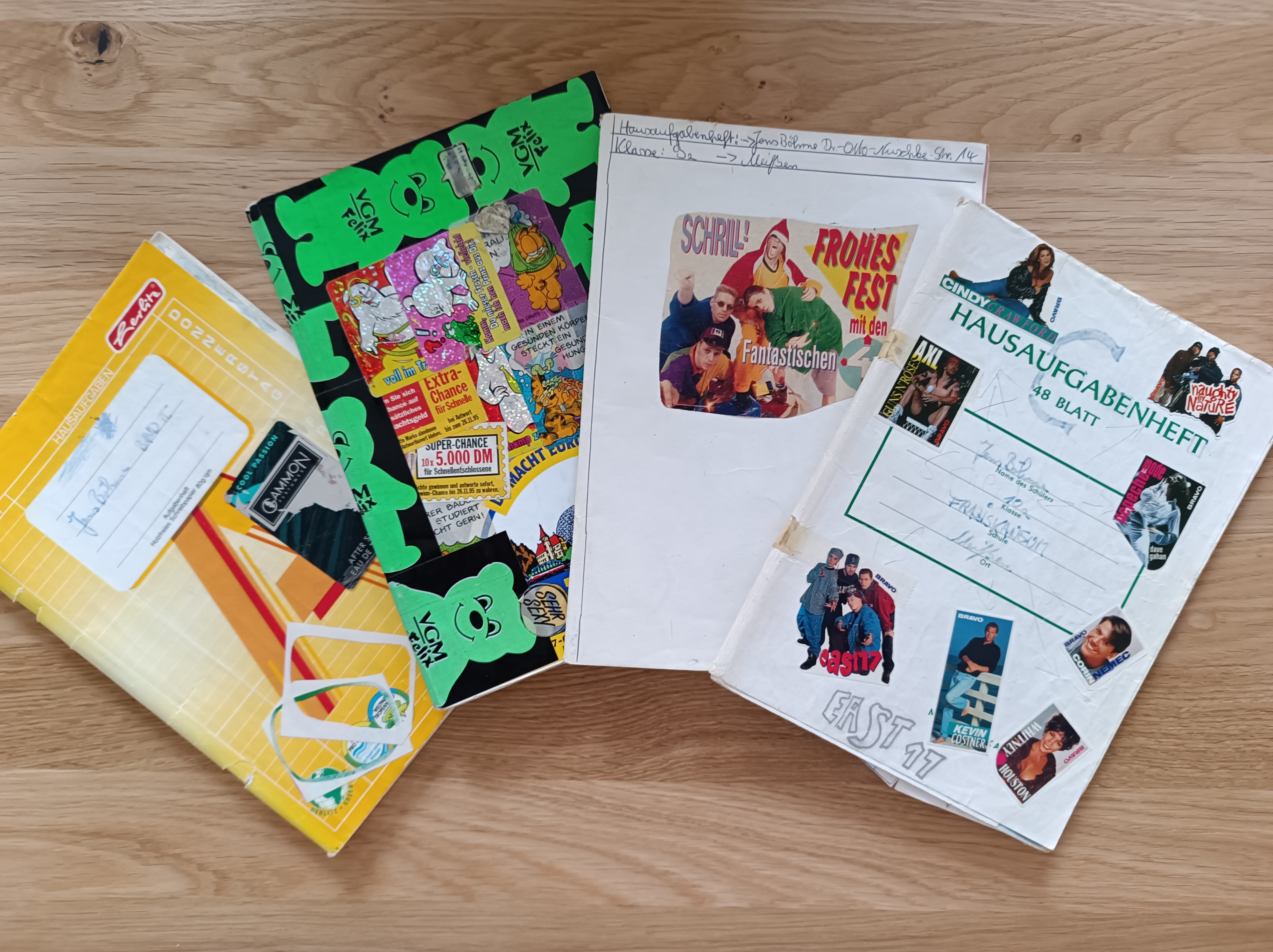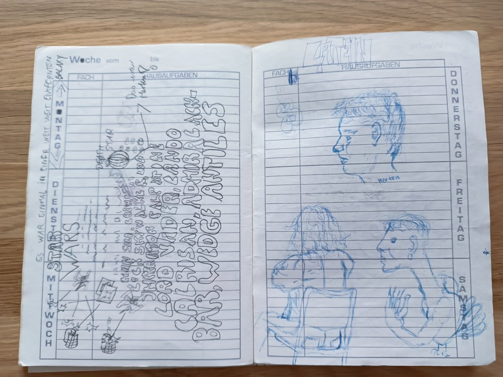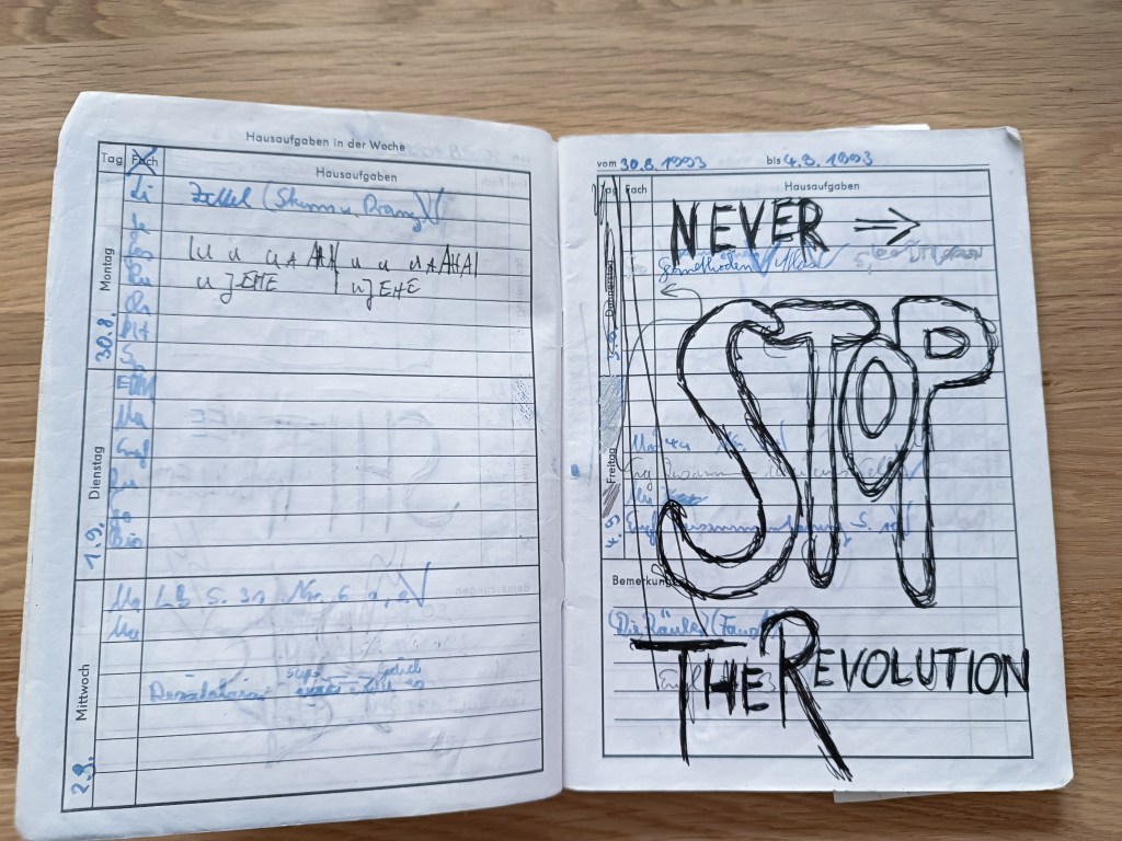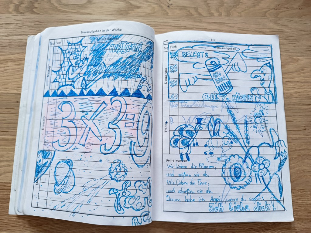 Einige meiner Hausaufgabenhefte aus der Zeit des Gymnasium habe ich immer noch! Sie haben Zeit, quasi die Umzüge und das Ausmisten von Dingen, überlebt. Zum einen habe ich sie behalten, weil es in ihnen viel zu entdecken und immer wieder etwas neu zu erinnern gibt und zum anderen, da sie regelrecht Tagebücher mit Kunstwerk-Charakter sind. Gern zeige ich meinen Kindern oder interessierten „meine alten verrückten Hausaufgabenhefte“. Es ist stets wie eine Zeitreise zurück in die Schulzeit am Gymnasium FRANZISKANEUM!
