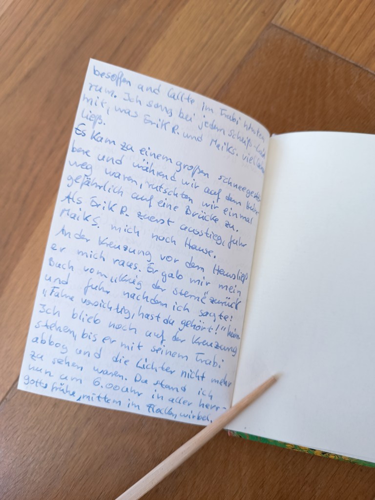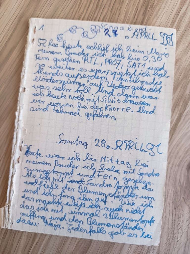 Immer wieder mal so zwischendurch entstehen eher Tagebuchfragmente. Dann schreibe ich eine Zeitlang meine Erlebnisse in eines meiner Moleskine Blanko-Bücher oder berichte von besonderen Ereignissen oder skurillen Situationen. Ein etwas größeres Tagebuch-Fragment ist zum Beispiel das Tagebuch „Ich erzähl ich 42 Tage von meinen Leben“. Das Blanko-Buch habe ich zu Weihnachten 1995 geschenkt bekommen und auch am gleichen Tag angefangen (siehe hier Foto der ersten Seite). Ich habe es dann über die Feiertage und über die Winterzeit 1996 bis hin zu meinen Abiturprüfungen geschrieben. Immer wieder nehme ich gern das Buch in die Hände und stöbere darin und ich fühle mich in diese, meine Jugendzeit zurück versetzt. Das waren die 90er Jahre – eine echt coole Zeit! Oft geht darin um Liebe (Wer mit wem), Diskothekenbesuche und Rave-Events, Unternehmungen mit Freunden und Freundin, auch um meine eigene damalige Partnerschaft und um die engsten Freunde und um die Gedanken eines Jugendlichen aus der Mitte der 90er Jahre.