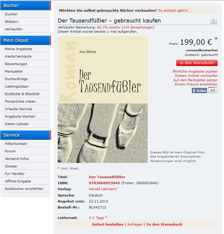 Natürlich weiß ich bzw. kann ich mir vorstellen, dass es sich hier sicherlich um ein automatisiertes Versehen bei der Preisgestaltung handelt. Ich nehme es mit Humor und sagte mir auch hier wieder: Diesen Fakt musst Du einfach bringen! Gesagt, getan – auch diese Begebenheit zur Story und zum Thema Buchtitel „Der Tausendfüßler“ findet hier Anklang. Und ich schwöre, hier ist nichts gephotoshopt – nur schnell ein Screenshot gemacht und fertig!