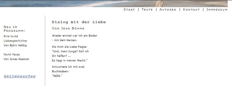Ich möchte hier ein Projekt vorstellen, auf das mich ein Journalistenkollege aufmerksam machte. Es handelt sich um die Webseite ZEILENSURFER. Wie bei allen Projekten steht am Anfang eine Idee mit einem Ziel dahinter. Hier steht in erster Instanz die Person Jonas Kassner hinter der Idee: eine Plattform für feste Autoren zu etablieren. Er kreiert die Webseite nicht nur grafisch in eigener Regie, sondern engagiert und präsentiert sich zuvorderst vor allem auch als einer der Hauptautoren mit eigenen Texten.